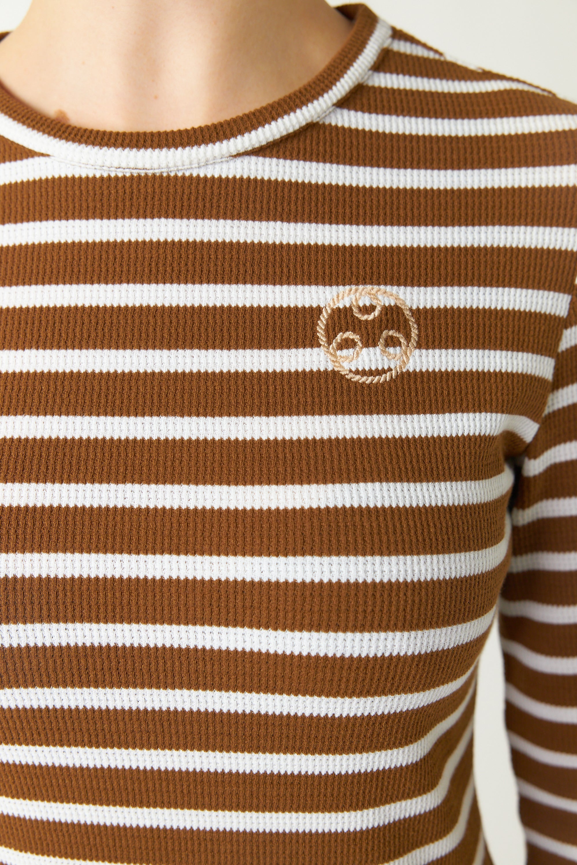 The Sailor stripe dress is neat fitting pull on style. It has a round neck, long sleeves and a subtle A-line skirt to the knee.