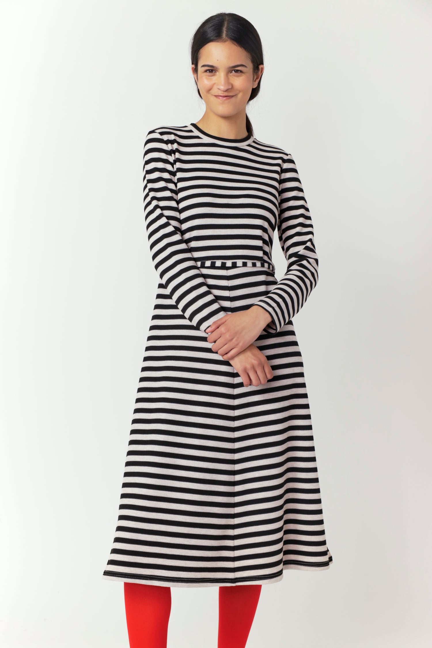 The Stripey dress is a classic Sylvester style with a round neck, long sleeves, flattering shaped waist, and a midi-length, A-line skirt. Pair with trainers for weekend ease or ballet flats for a dinner date and throw on our to take you to work.Nevaeh is 5'8 and wears size 8.