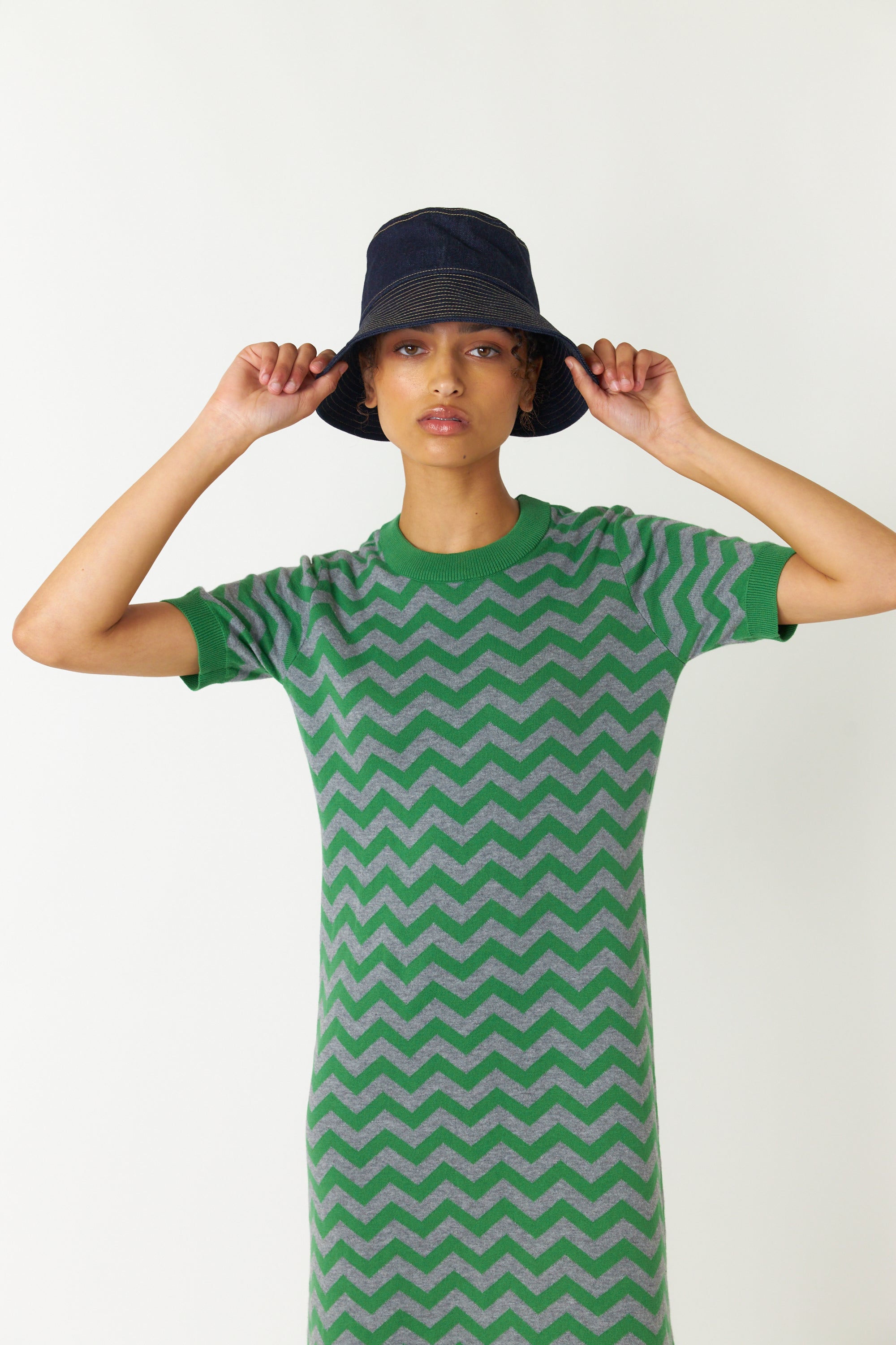 Our Twin peaks dress features a unique jacquard zig zag design. It’s a neat fitting A line dress that finishes just above the knee. The perfect transeasonal dress, pair with our Denim bucket hat for some extra sun protection.