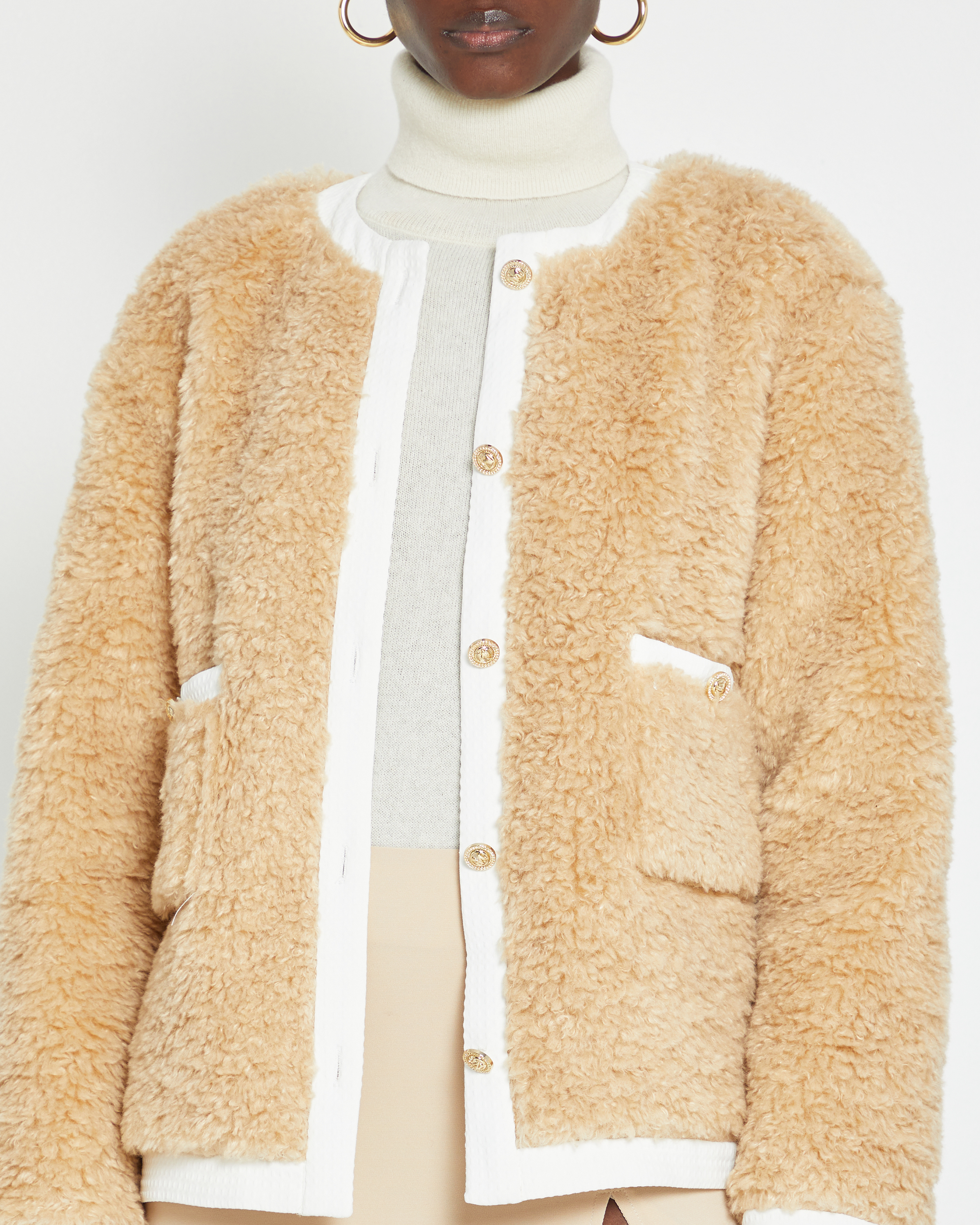 Stay warm and look stylish with the Sheila Coat. Crafted from fluffy faux shearling and lined with a light cream material, this coat features subtle gold buttons for a luxe look. All you need for cold weather days.