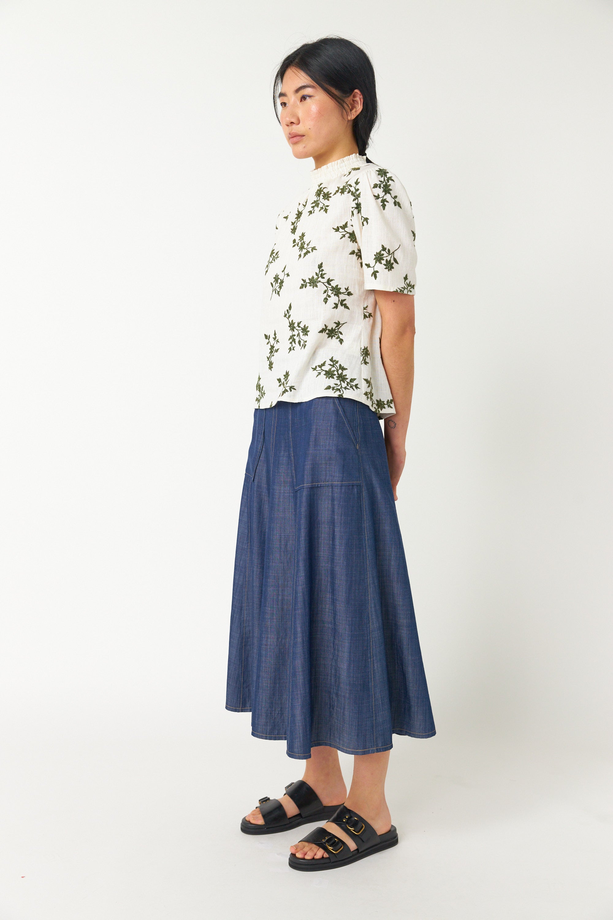The Traveller skirt is an effortless midi-length style featuring two front patch pockets, pull-tabs at the waistband for a customizable fit and top-stitch detailing throughout. Pair with the for an effortless look.
