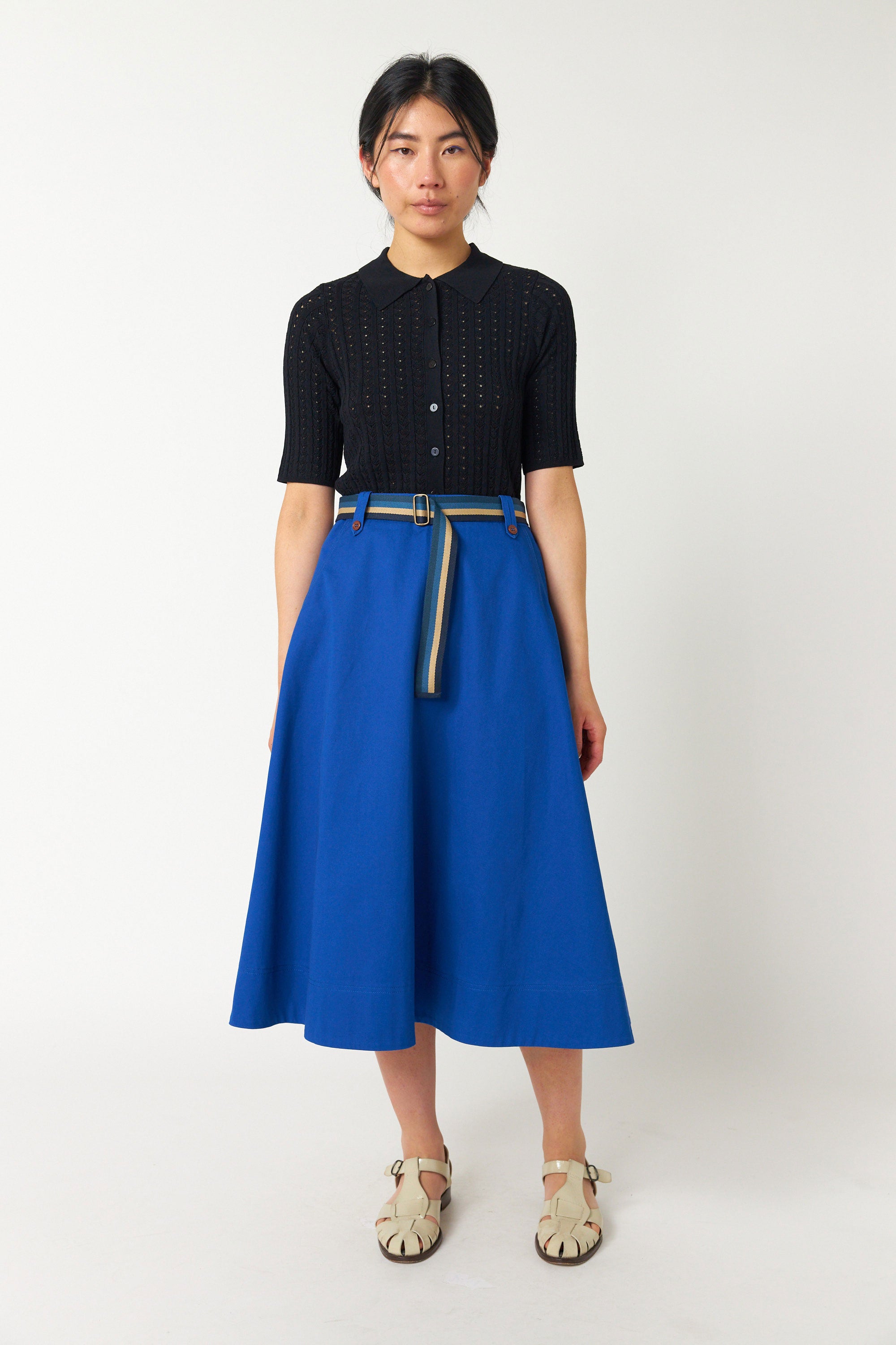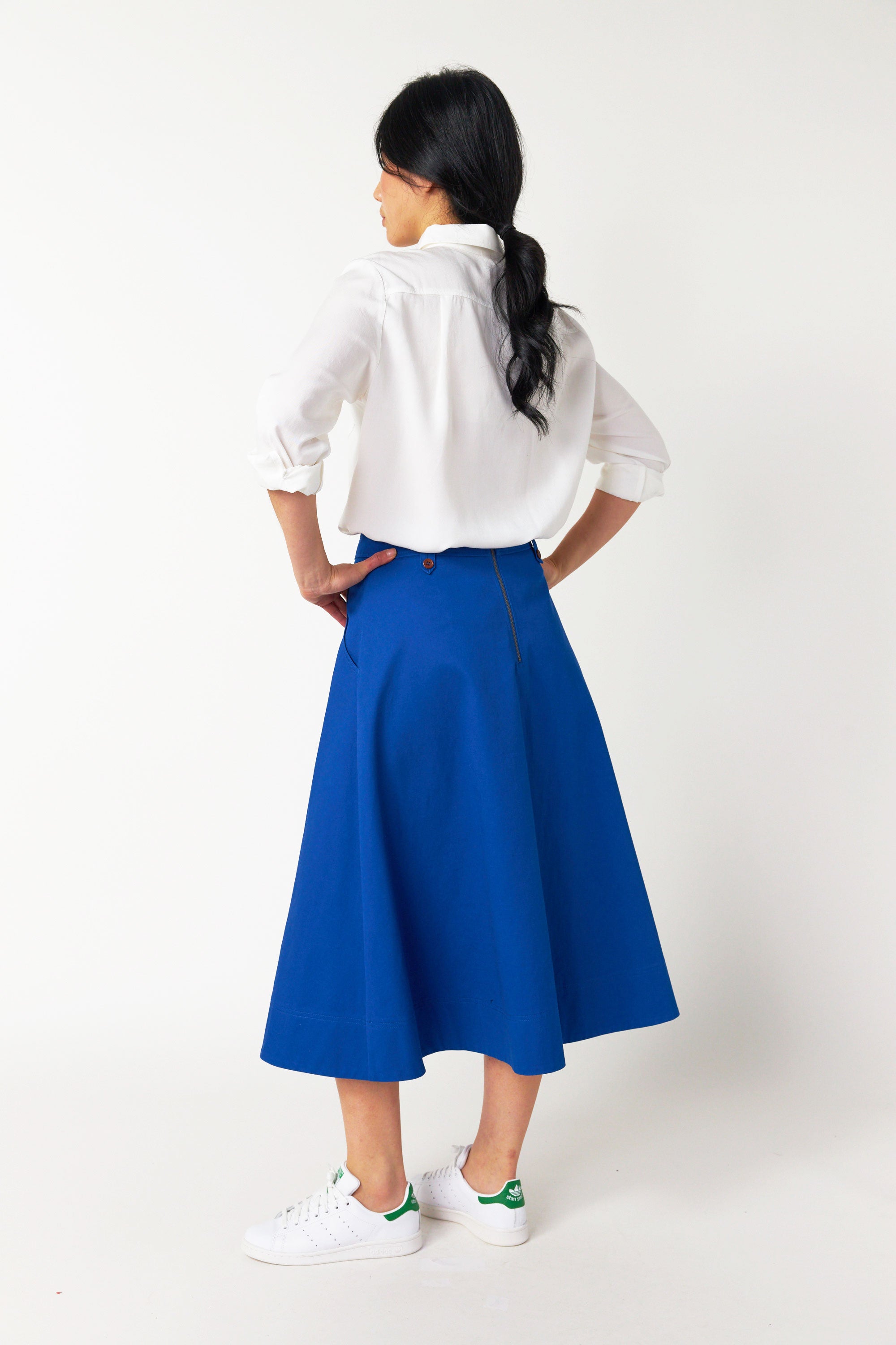 Our Workwear skirt is very flattering. Made of 100% cotton, this skirt features contrast buttons on belt loops, a rear zip closure, and helpful angled front pockets. We suggest pairing with the or the as seen here.